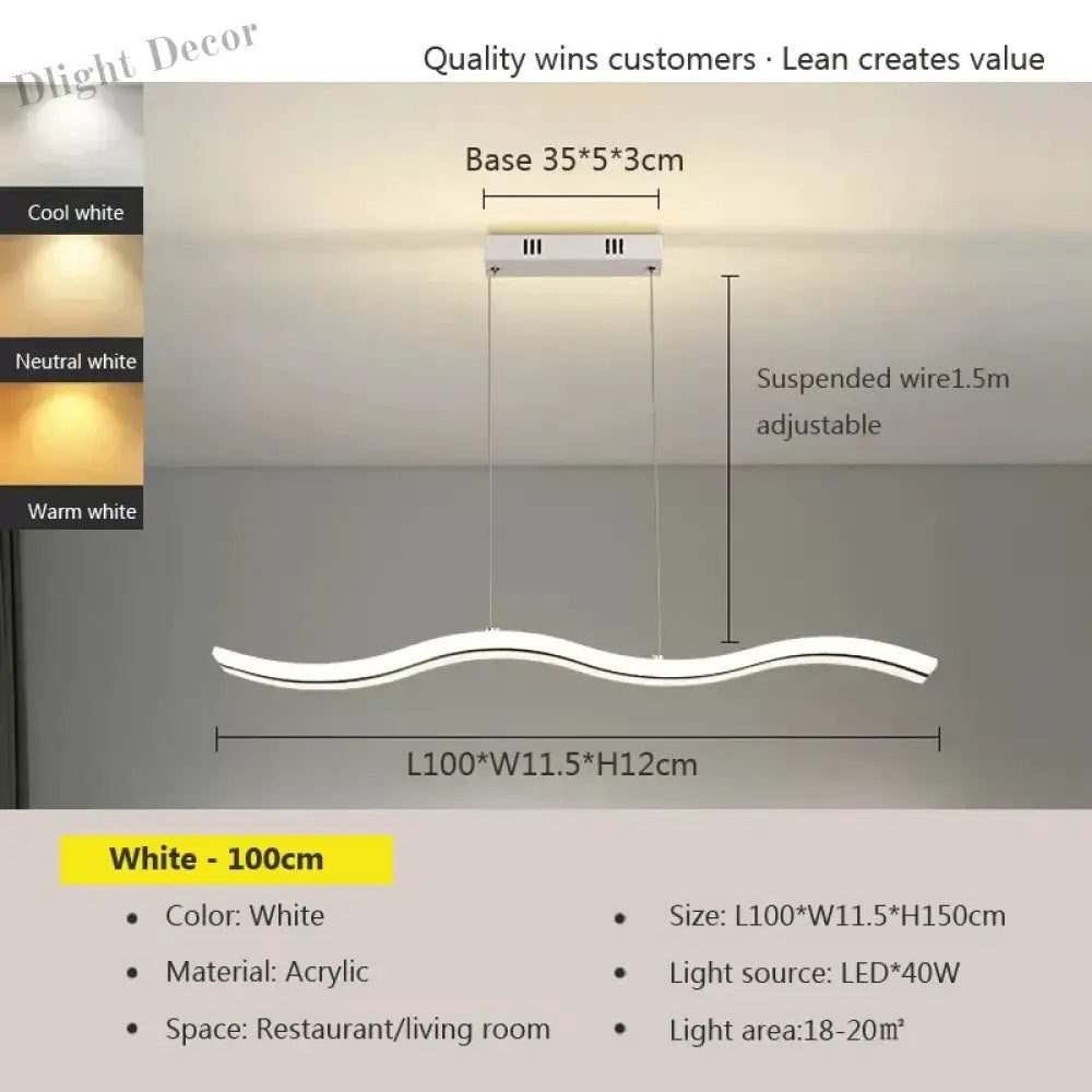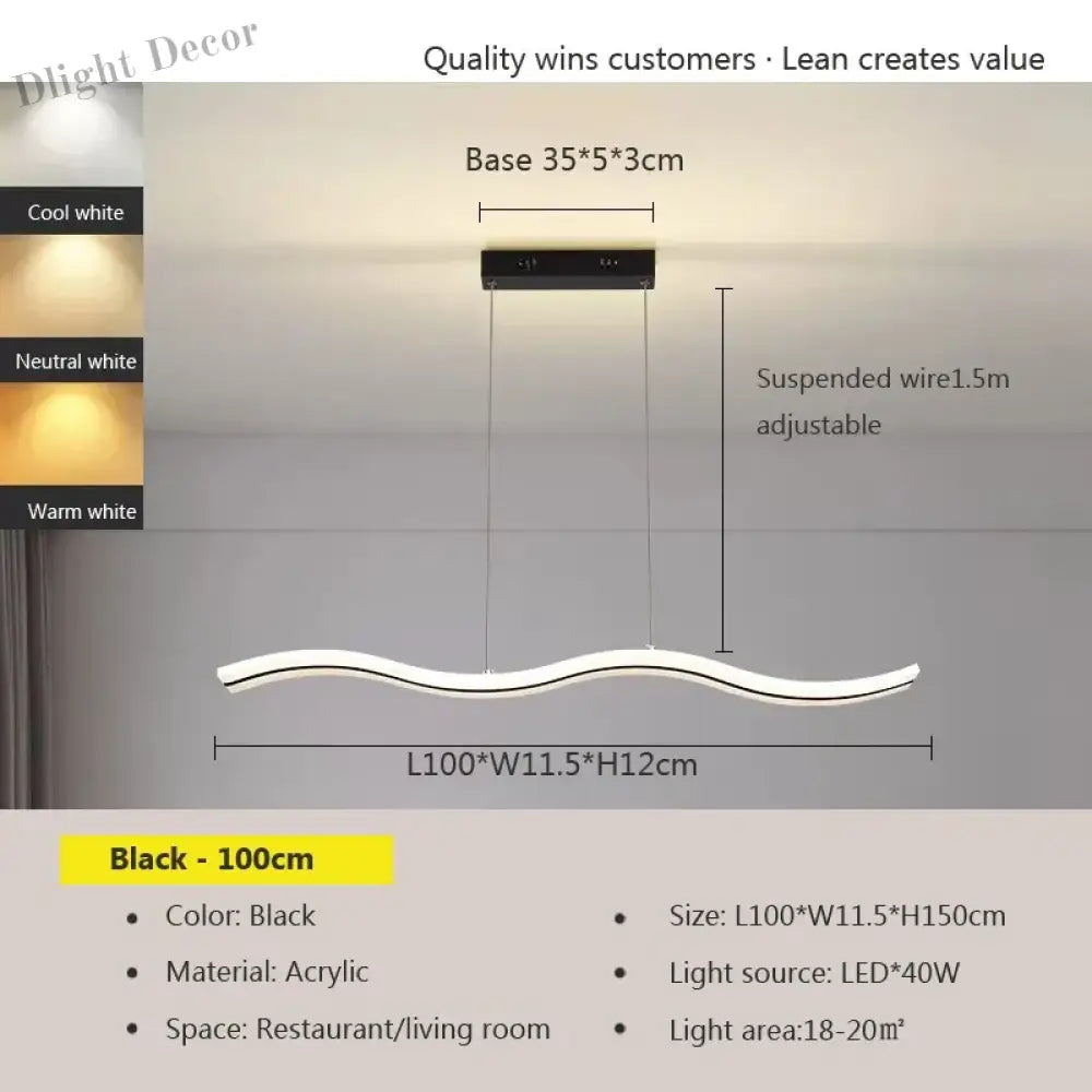 Elevate your interior decor with our Sleek LED Wave Pendant Light, designed to add a touch of modern minimalism to your dining rooms and enhance the creative ambiance of your restaurant decor. This stylish lighting fixture combines simplicity with functionality, enhancing the overall aesthetic of your space.