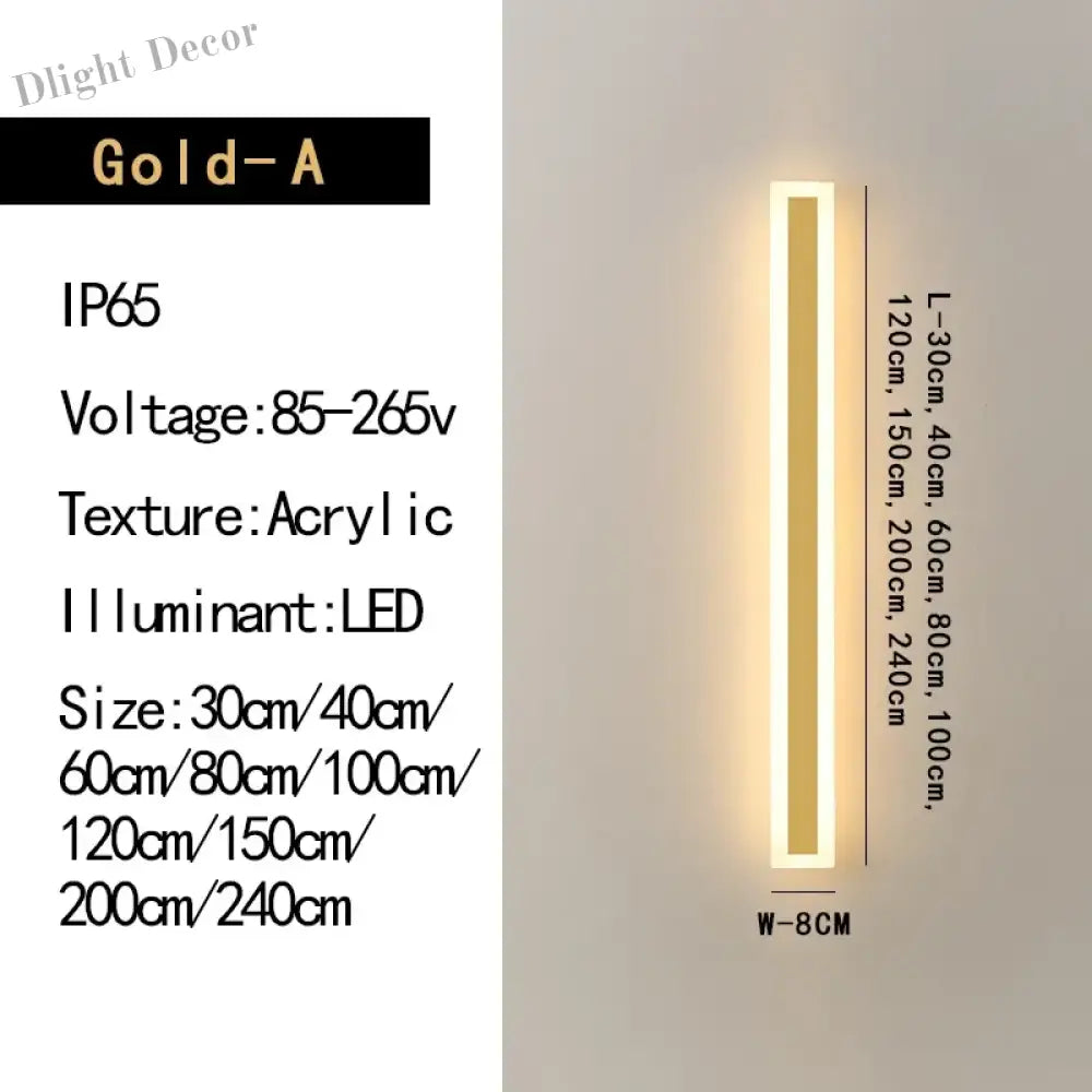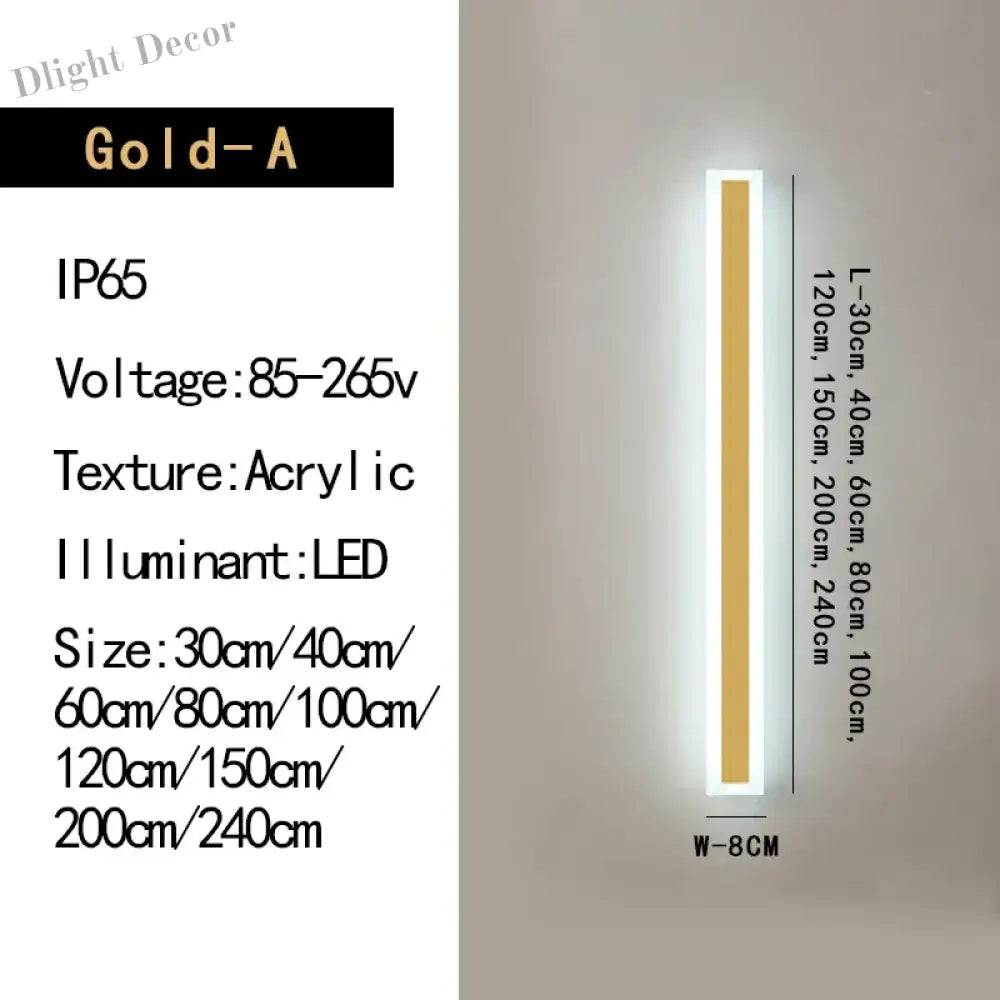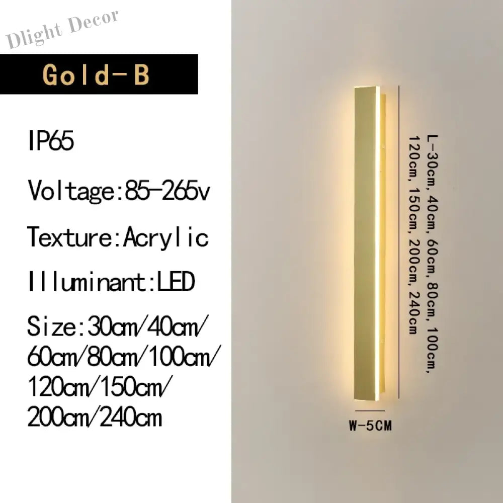 Illuminate and beautify your outdoor spaces with our Elegant Golden LED Long Wall Light. Designed to withstand outdoor elements with its IP65 waterproof rating, this modern wall light serves as a decorative masterpiece, adding a touch of luxury to country villas, courtyards, and balconies while providing ample illumination.