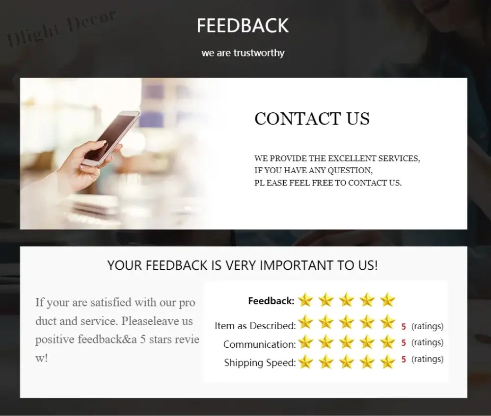 For further inquiries or support, reach out to our friendly team. We're here to assist and ensure you have a smooth shopping experience with Dlight Decor.