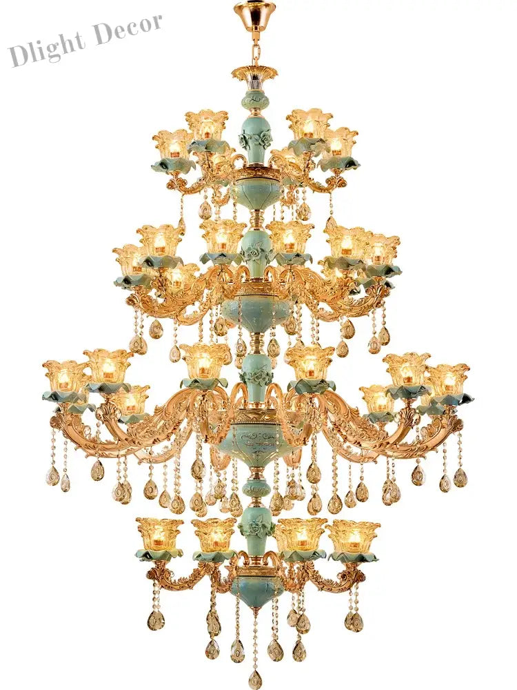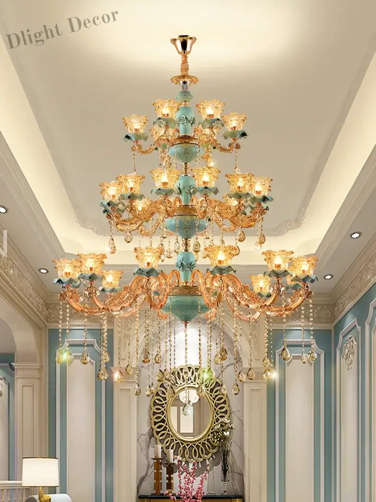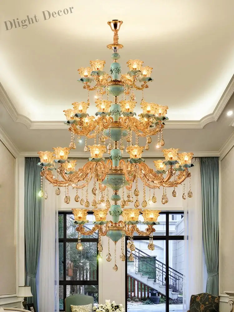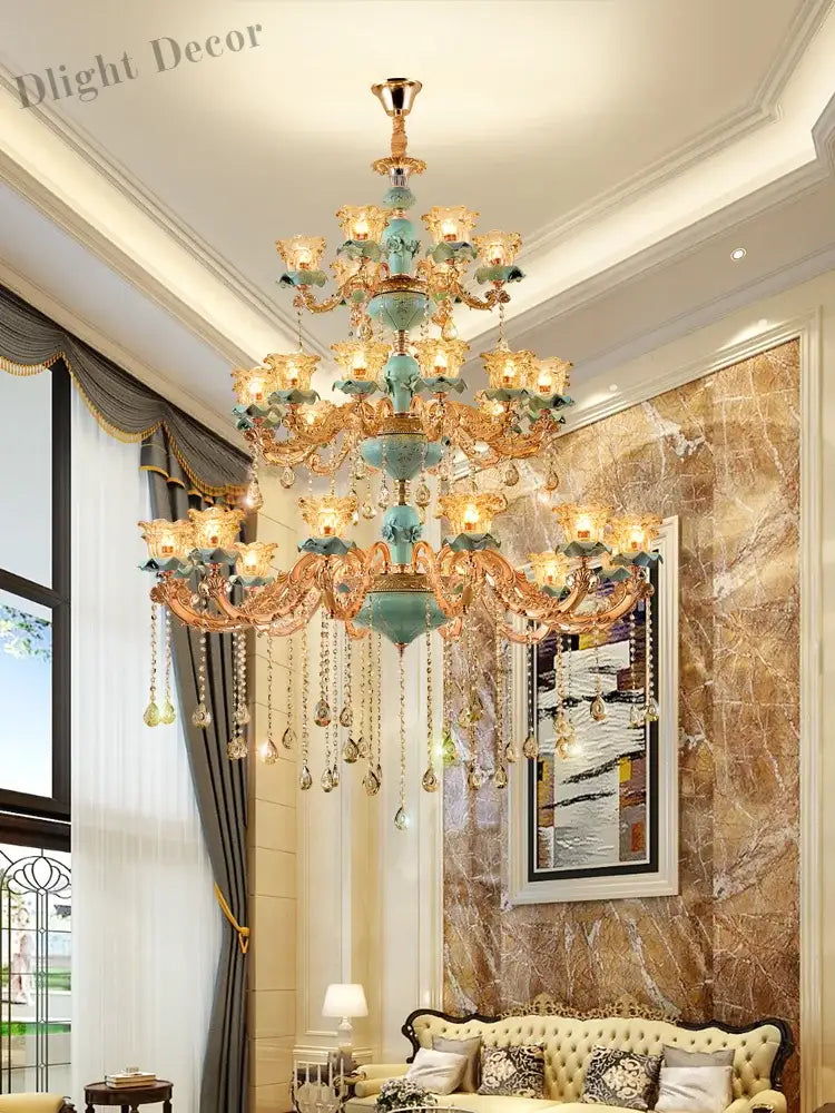 Enhance your interior decor, living rooms, hotels, and ceramic staircases with the European-Style Duplex Building Chandelier. It is an elegant statement piece that adds European opulence, ceramic accents, and a touch of timeless charm to your space. Illuminate your space with this stylish and functional chandelier, featuring exquisite details that enhance the overall aesthetics and create a sense of grandeur in your home or commercial setting.