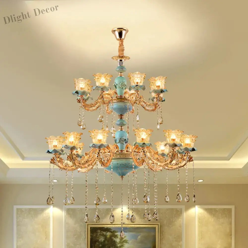 Elevate the ambiance of your interior decor with our European-Style Duplex Building Chandelier. This exquisite lighting fixture embodies European design with a touch of grandeur, featuring ceramic accents and crystal elements that add opulence and charm. Ideal for living rooms, hotels, and ceramic staircases, it stands as an elegant and stylish lighting solution that enhances the overall beauty and sophistication of your space. Illuminate your space with the warm and inviting glow of this luxurious chandelier.
