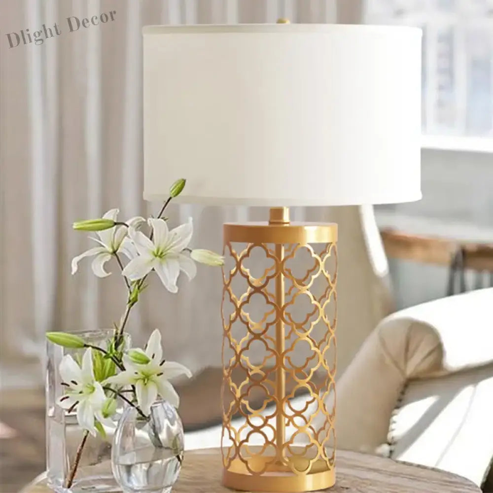 This lamp is perfect for enhancing the atmosphere in your bedroom, dining room, living room, restaurant, hotel, hallway, and more. Its warm LED lighting creates a cozy and inviting environment, while the exquisite design serves as a stunning decorative piece. Upgrade your lighting and decor with this luxurious American Golden Wrought Iron Hollow Pattern Table Lamp.
