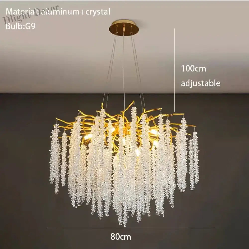 Elevate your interior with the Modern Crystal G9 LED Wall Lights, a piece of art meticulously crafted to enhance your parlors, bedrooms, dining areas, and artistic decor. These wall lights feature a captivating cherry blossoms and branches design in elegant gold aluminum, creating an ambiance of contemporary sophistication. With energy-efficient G9 LED lighting, they offer both style and functionality, making them an ideal addition to your lighting fixtures.