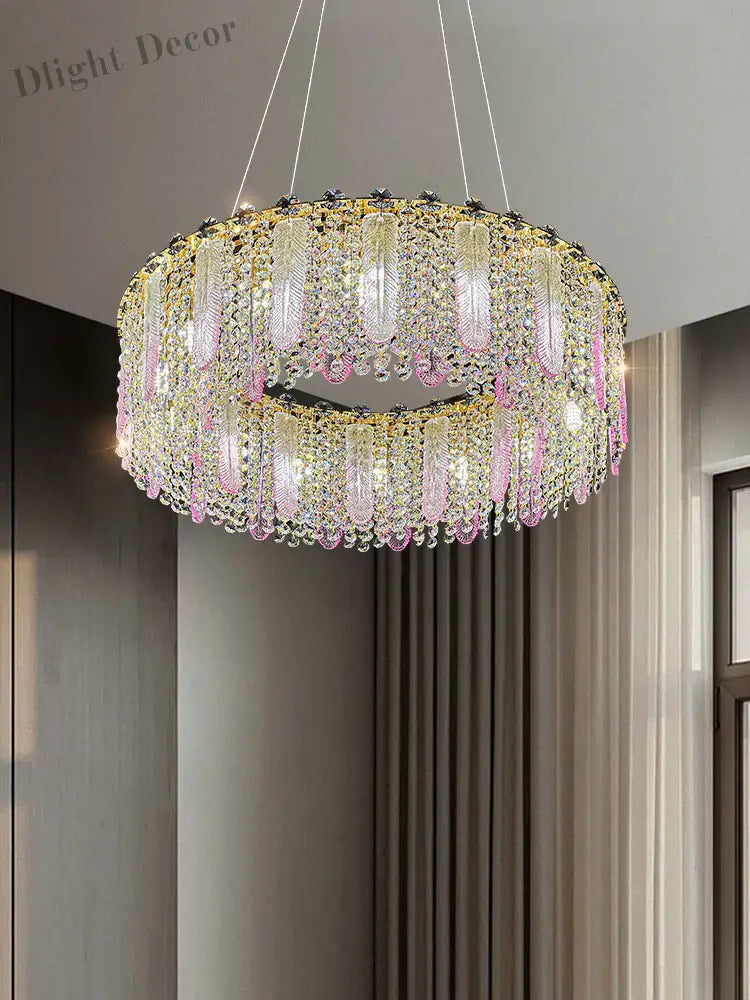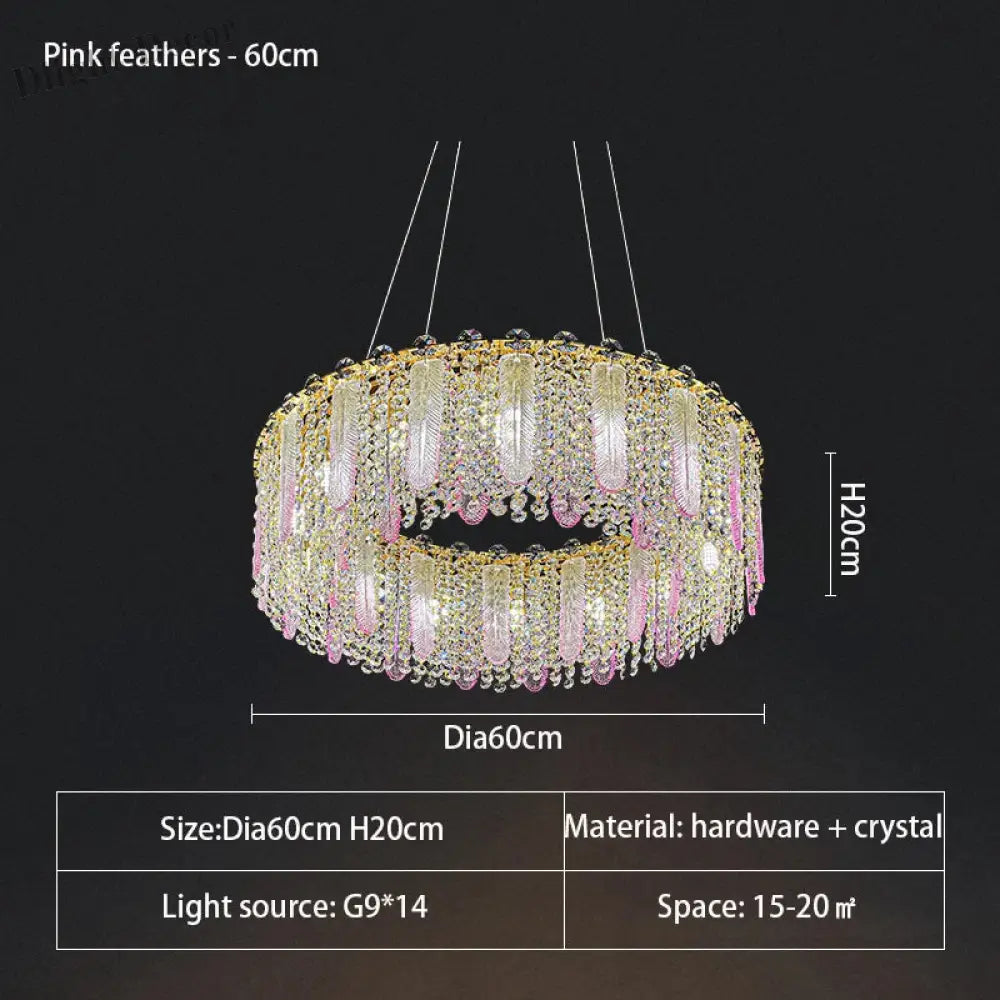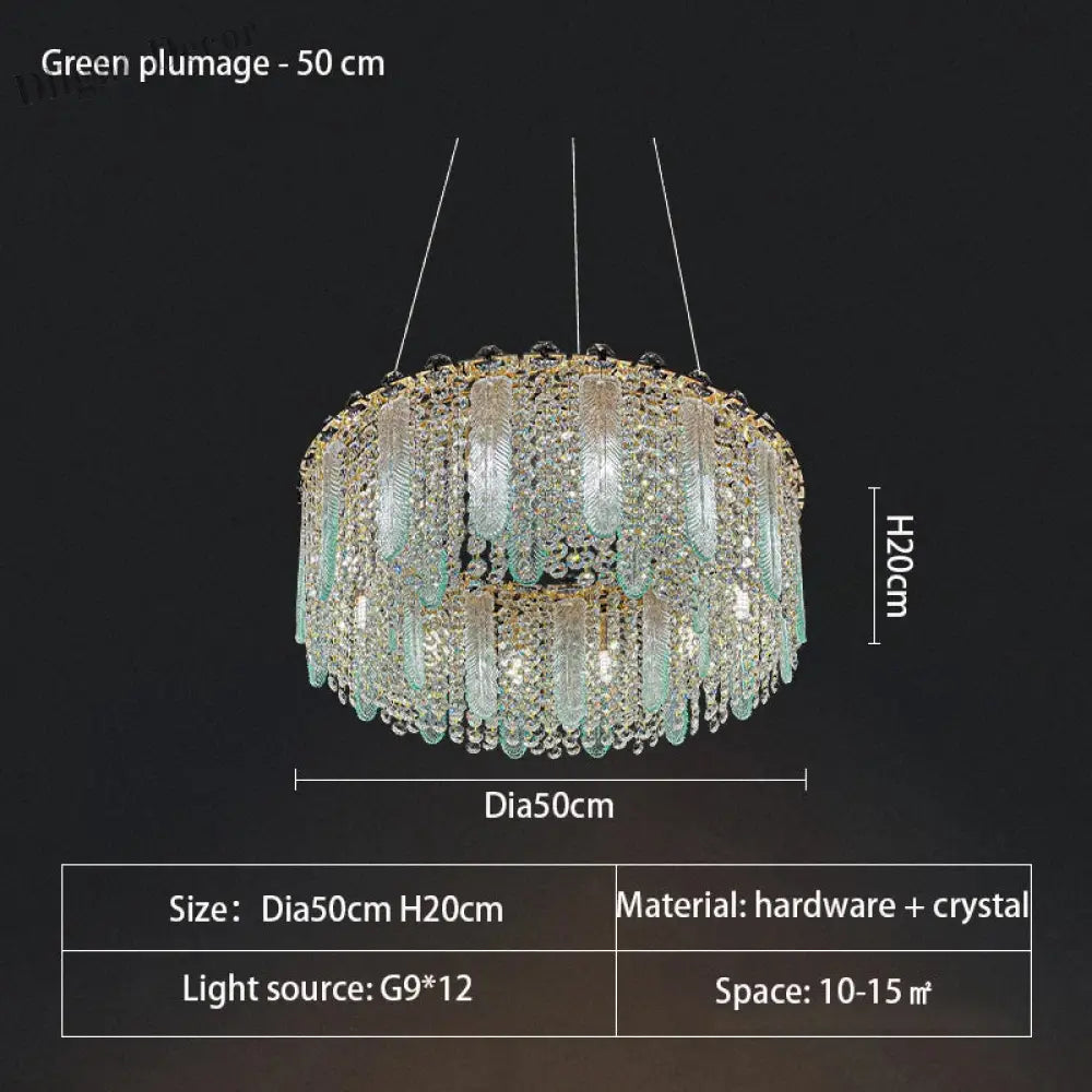 1. Élégance du cristal de plumes : Orné d'éléments en cristal et de plumes délicates, ce lustre respire l'opulence et capture l'essence du design de luxe léger.