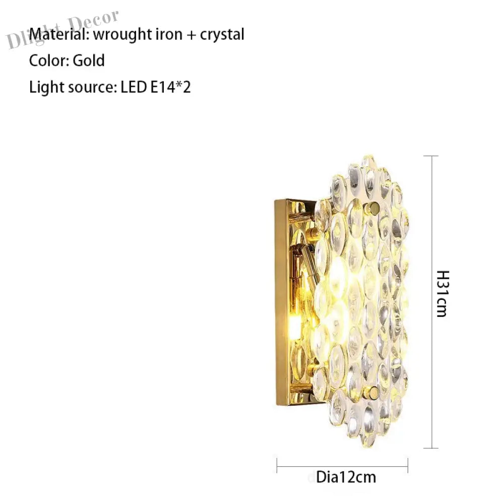 Présentation de l'applique murale minimaliste postmoderne en cristal Lyric Nordic - une superbe représentation du design contemporain et de la personnalité artistique qui enrichit l'ambiance de votre table de chevet, de votre salon, de votre couloir ou de tout autre décor intérieur. Cette applique murale unique est dotée d'un corps lumineux doré et est méticuleusement fabriquée en fer et ornée de détails en cristal exquis. Avec un diamètre de 12 cm (4,7 pouces) et une hauteur de 31 cm (12,2 pouces), elle offre un éclairage polyvalent avec une ampoule LED E14 incluse, fournissant une source de lumière gratuite qui peut changer de couleur en trois tons différents selon votre humeur.