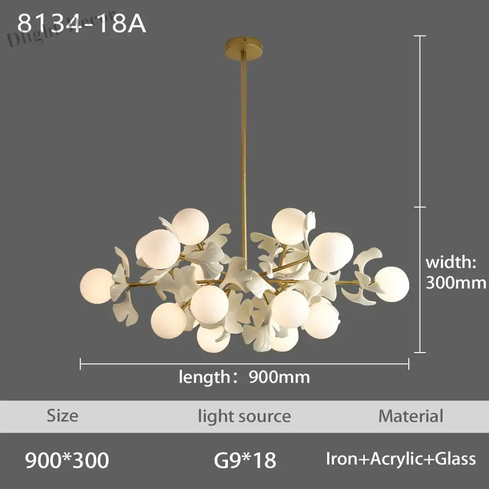 Lustre LED nordique - Design feuille de ginkgo avec feuilles blanches en acrylique pour salons et chambres, luminaire boule de verre ronde