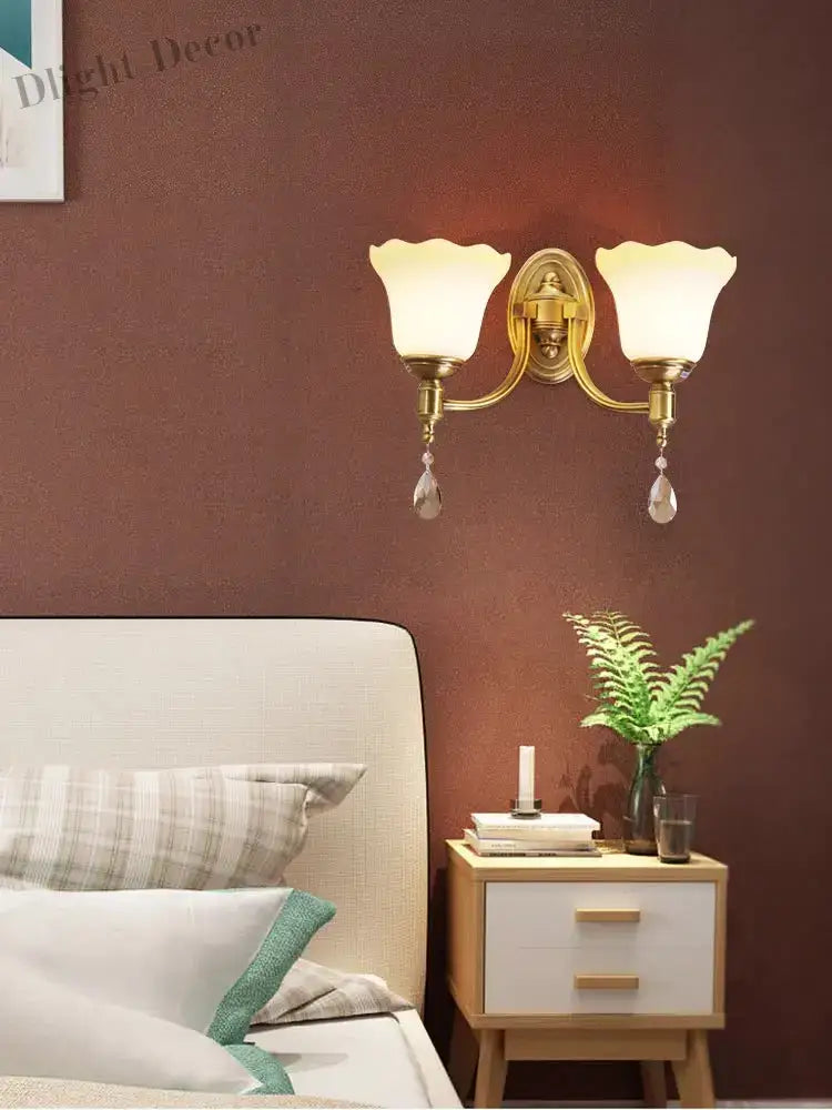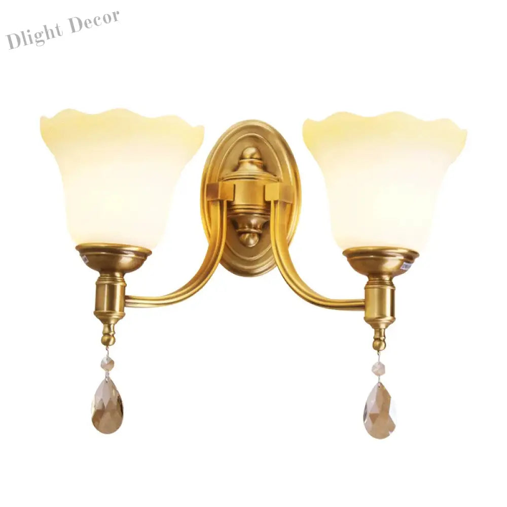 Sophia - Applique murale en verre de style européen, lampe murale de fond de télévision de salon chaleureux, chambre à coucher, chevet, double tête, lampe murale simple tout en cuivre