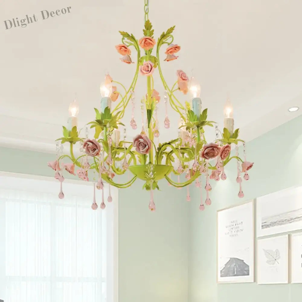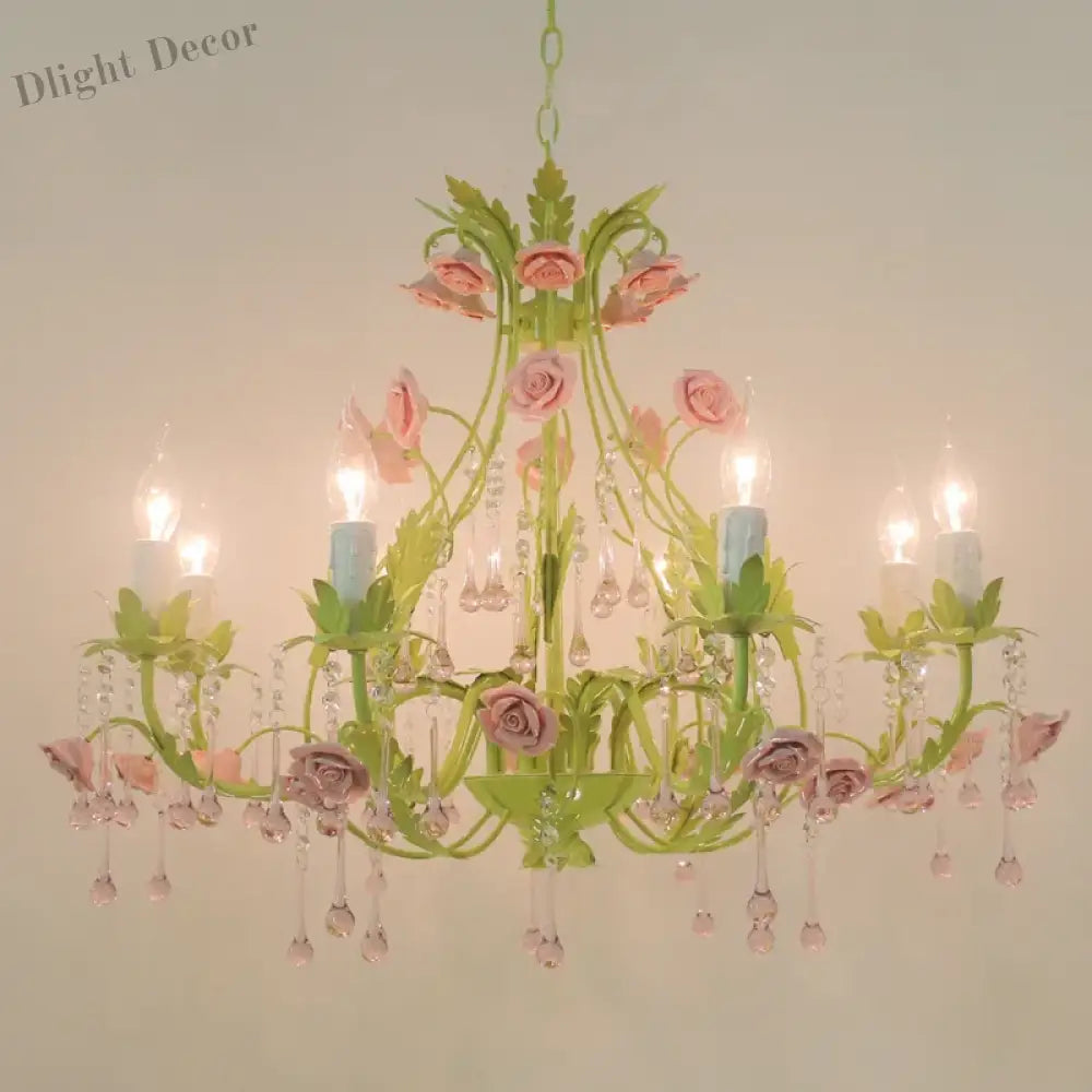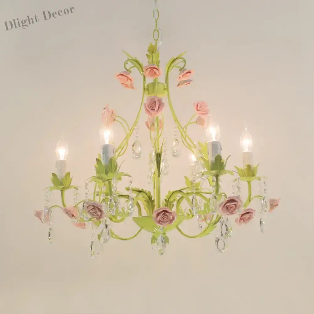 Lustre européen en forme de fleur de rose - Lustre vert en tailles 6L/8L/12L, luminaire décoratif E14 en rose