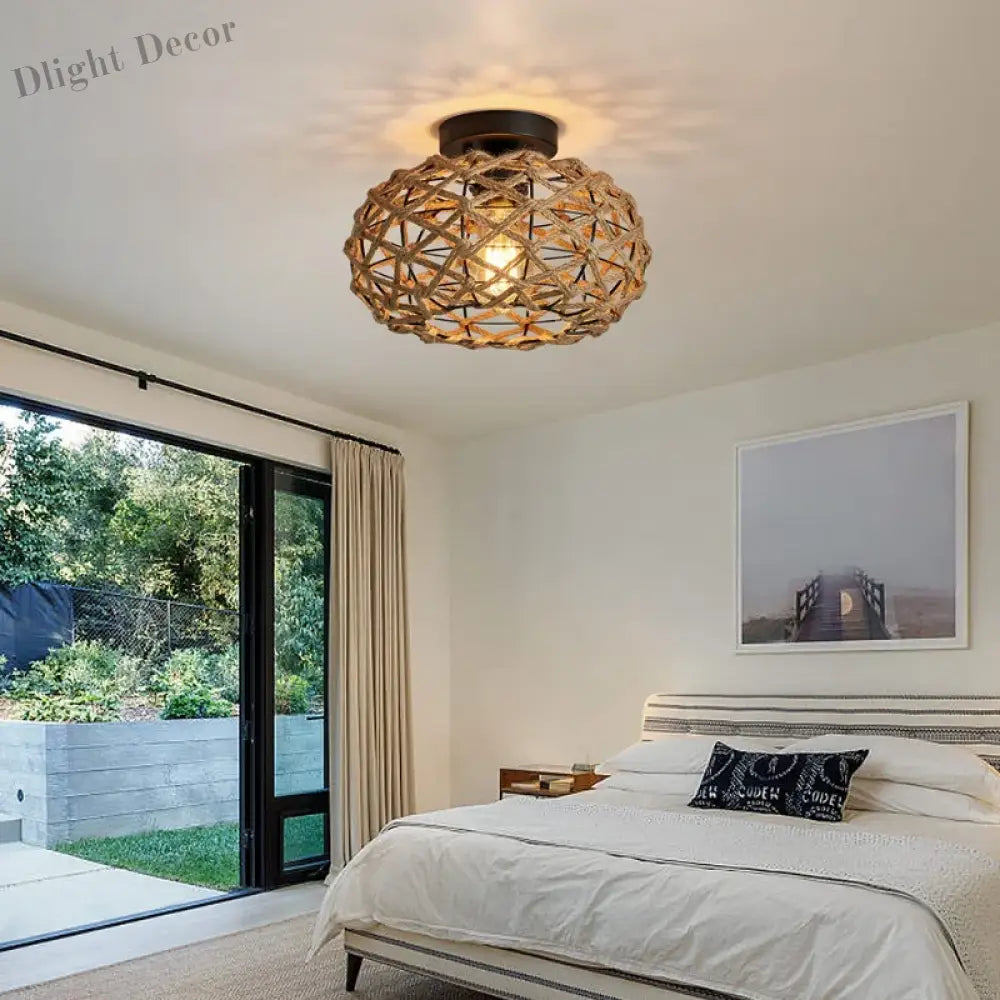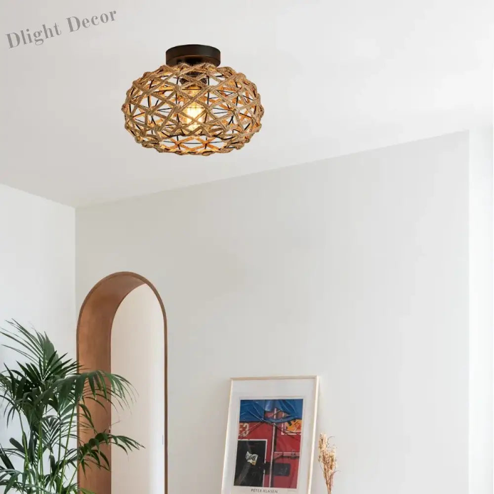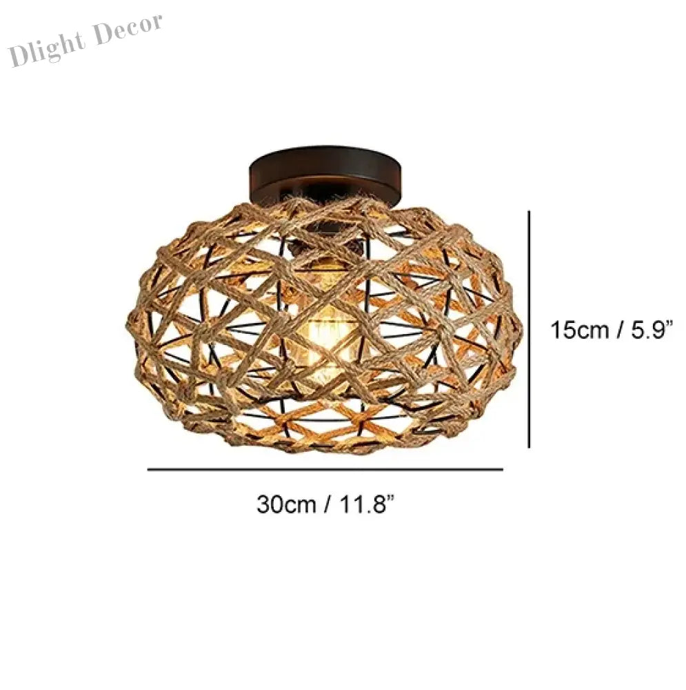 Boho Hemp Rope Cage Semi Flush Mount Ceiling Light - Rustic Elegance for Bedrooms and Beyond
