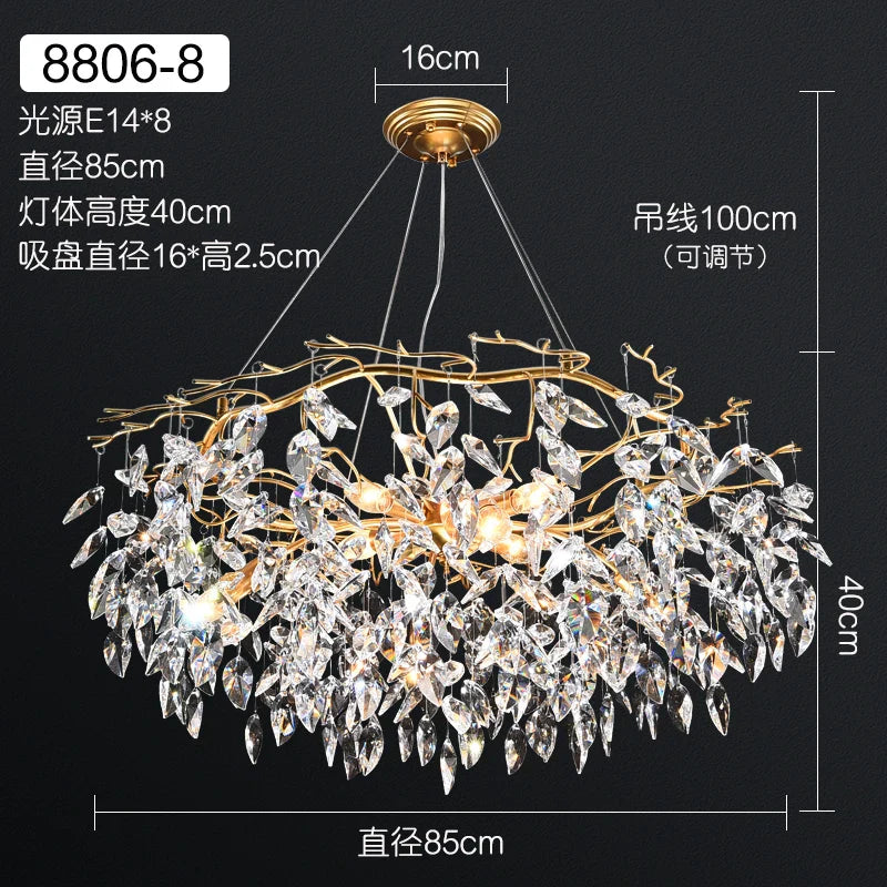 Illuminate and enhance your home with this Elegant Long Gold K9 Crystal Chandelier. It seamlessly combines elegance, luxurious design, branch-style chandeliers, K9 crystal adornments, and versatility for a sophisticated and well-lit living environment in spaces such as the kitchen, dining room, bedroom, and living room.