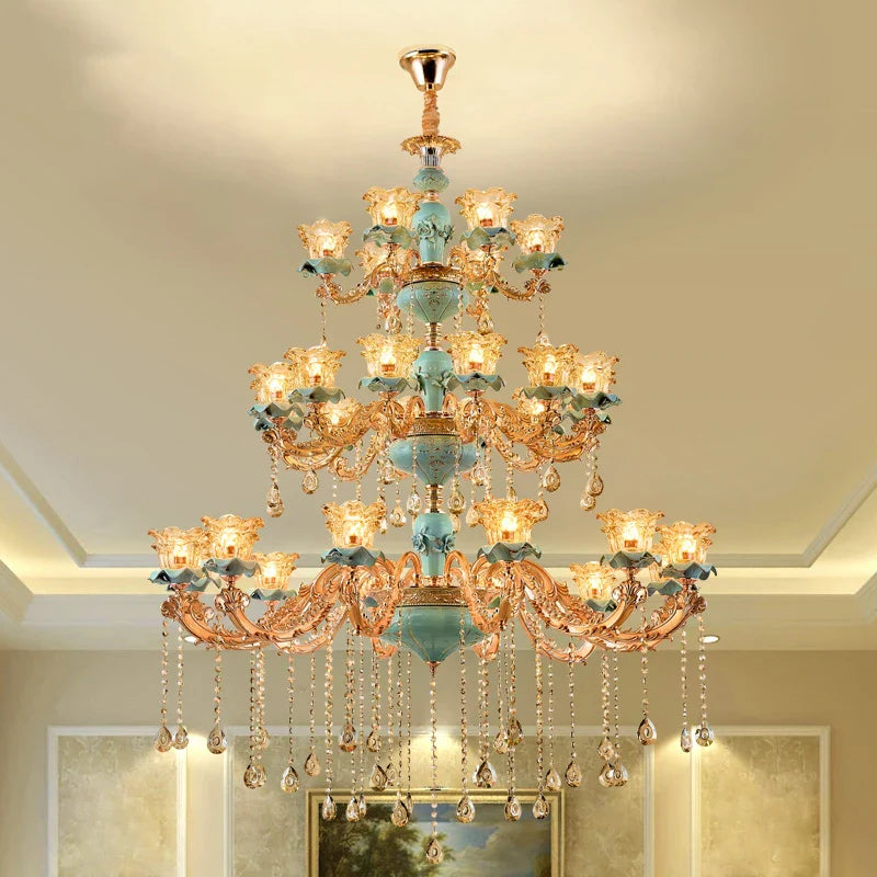 Elevate the ambiance of your interior decor with our European-Style Duplex Building Chandelier. This exquisite lighting fixture embodies European design with a touch of grandeur, featuring ceramic accents and crystal elements that add opulence and charm. Ideal for living rooms, hotels, and ceramic staircases, it stands as an elegant and stylish lighting solution that enhances the overall beauty and sophistication of your space. Illuminate your space with the warm and inviting glow of this luxurious chandelier.