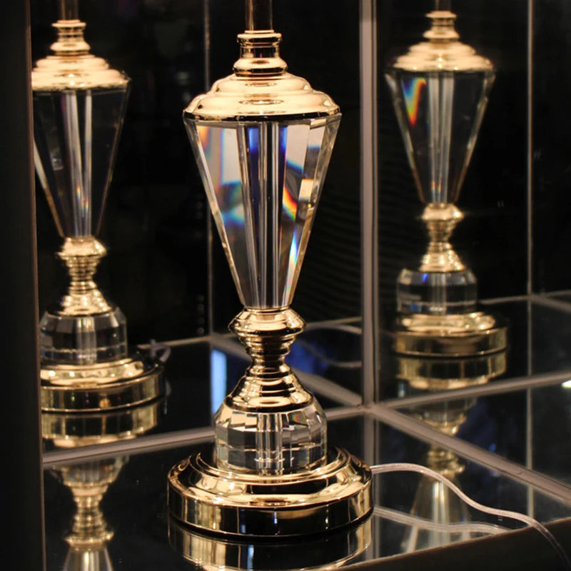 This European-style table lamp features a transparent crystal body paired with a classic fabric lampshade, creating an elegant and timeless lighting accent. Designed for decorative and functional use, it delivers soft ambient illumination while enhancing the visual richness of study and bedroom interiors. The refined crystal detailing and golden frame elements add a touch of luxury to traditional home décor.