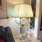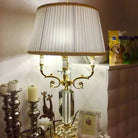 This European modern table lamp features a golden-plated crystal and metal body with a classic fabric shade, designed to bring elegance and sophistication to interior spaces. Its candelabra-inspired design provides soft, ambient lighting suitable for bedrooms, living rooms, or wedding and decorative setups. The touch on/off switch and premium finishes combine style with convenient functionality.