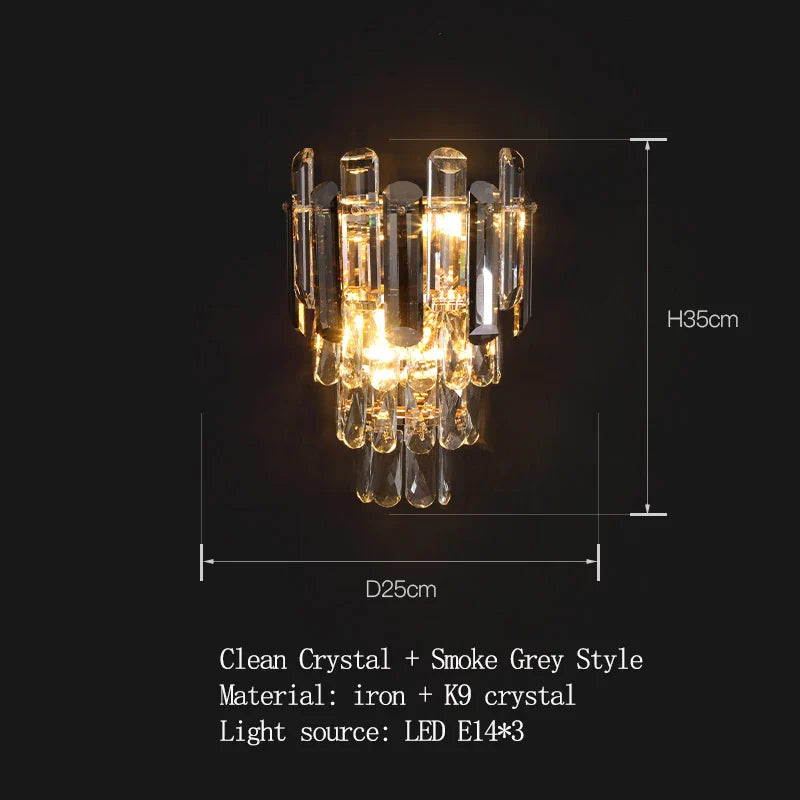 Introducing Abigail's Modern LED Crystal Wall Lamp, a symbol of modern elegance and sophistication that enhances the ambiance of your bedroom, bedside, living room, study, hallway, or aisle. This exquisite wall lamp is available in three stunning styles: clean crystal, smoke gray crystal, and a combination of clean crystal and smoke gray crystal. It features high-quality materials, including iron and K9 crystal, and offers versatile lighting with an LED E14 bulb that can change color.