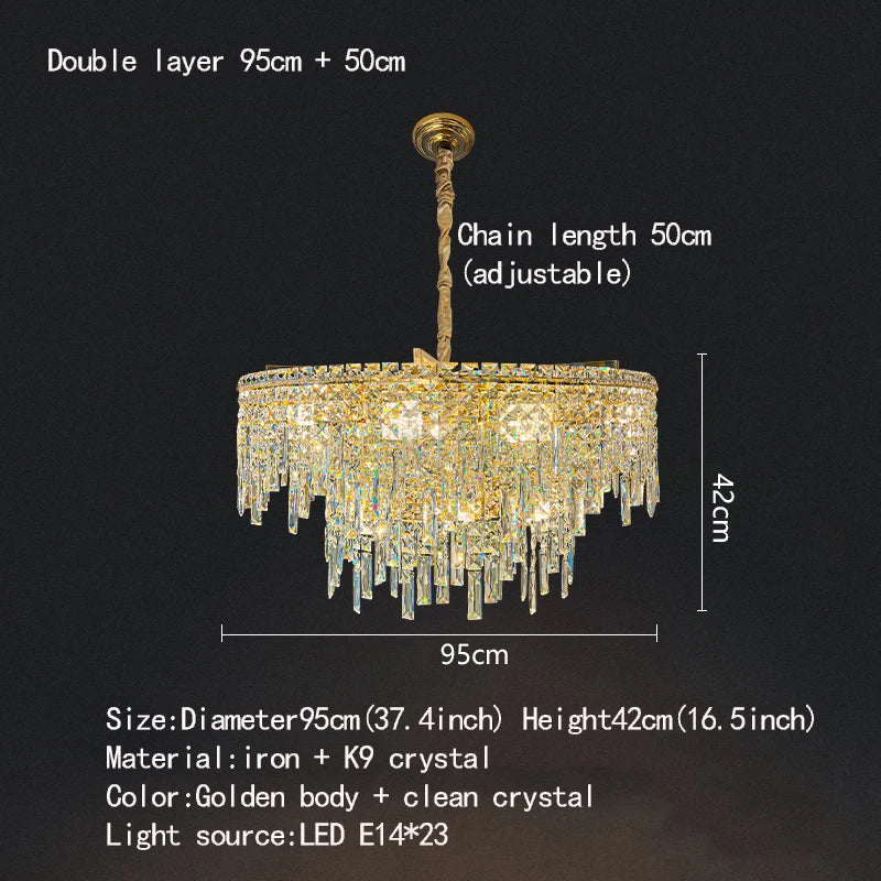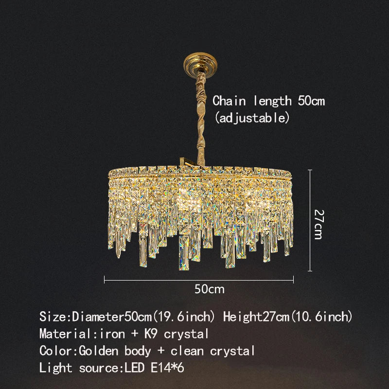 Rehaussez l'ambiance de vos espaces de vie avec le charme captivant de ce lustre rond doré. Illuminez votre maison avec l'élégance moderne et l'attrait intemporel du cristal, créant une atmosphère accueillante et sophistiquée qui laisse une impression durable.