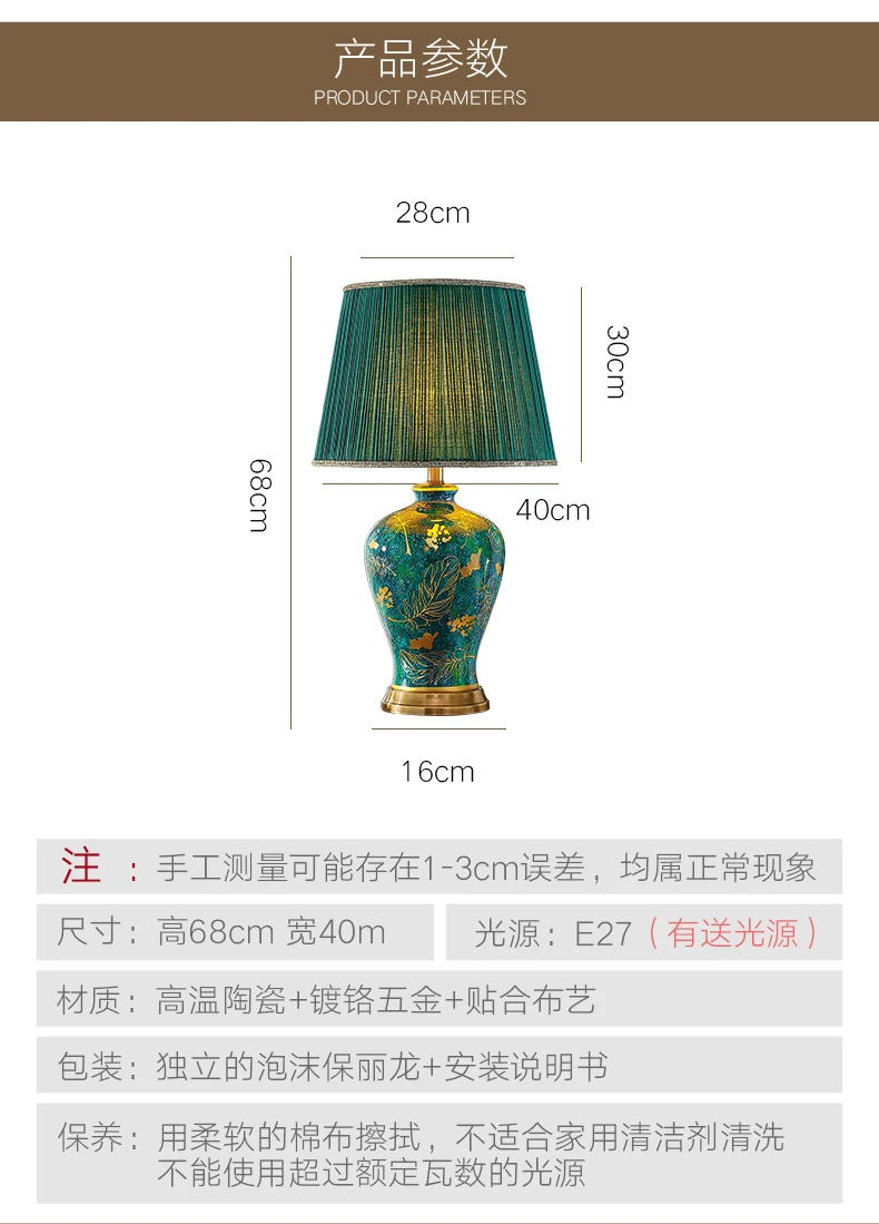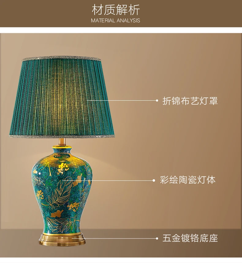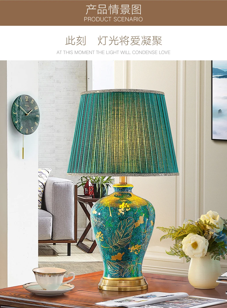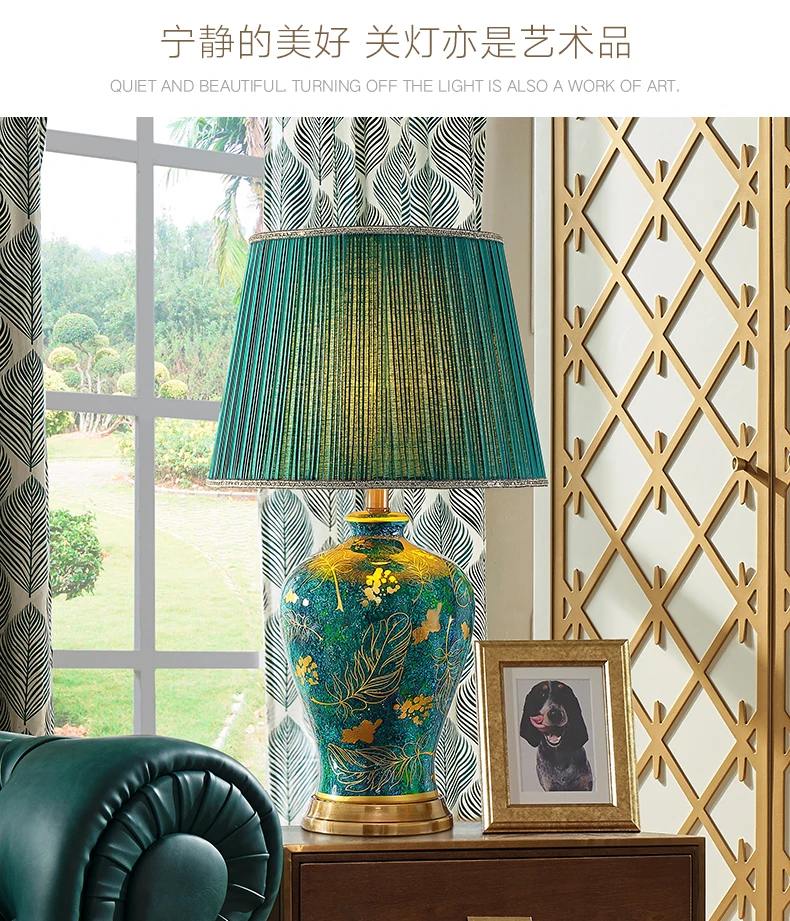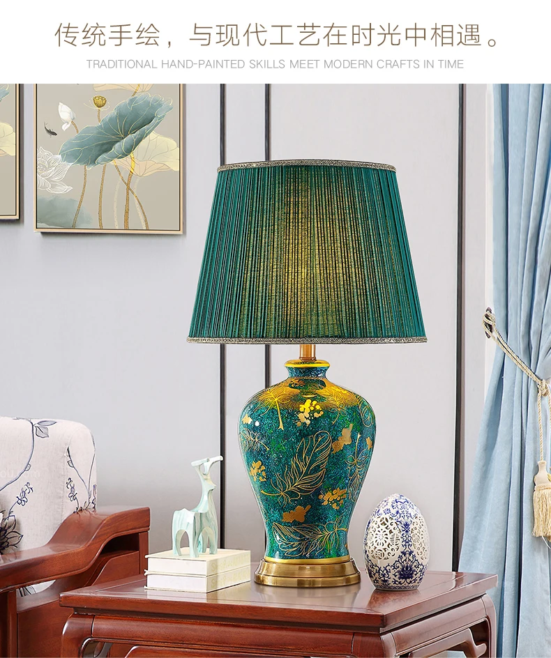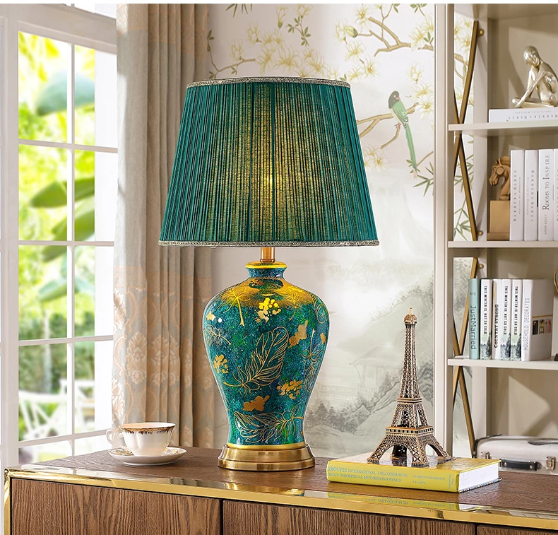 This elegant table lamp features a retro-inspired ceramic base in a rich green tone, paired with a soft fabric shade for warm, atmospheric lighting. Designed to enhance refined interiors, it adds a luxurious accent to bedrooms, living rooms, and upscale residential spaces. The balanced proportions and polished detailing make it both decorative and functional for everyday use.
