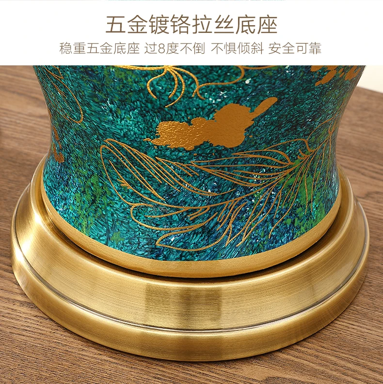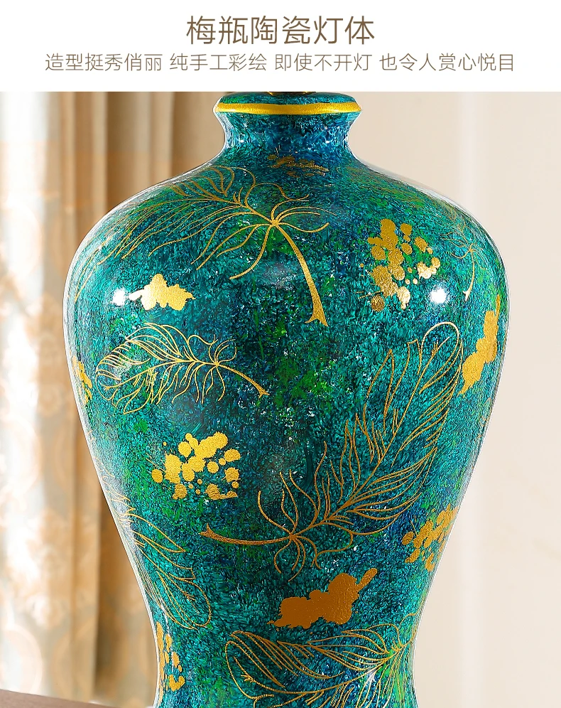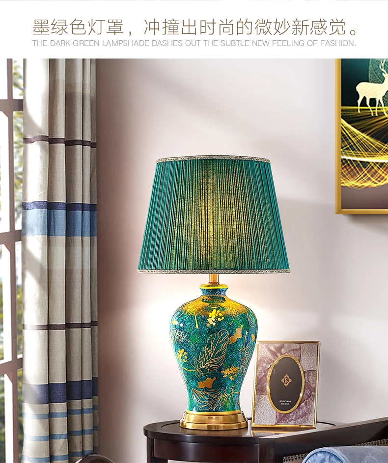 Retro Green Ceramic Table Lamp with Fabric Shade for Bedroom Living Room